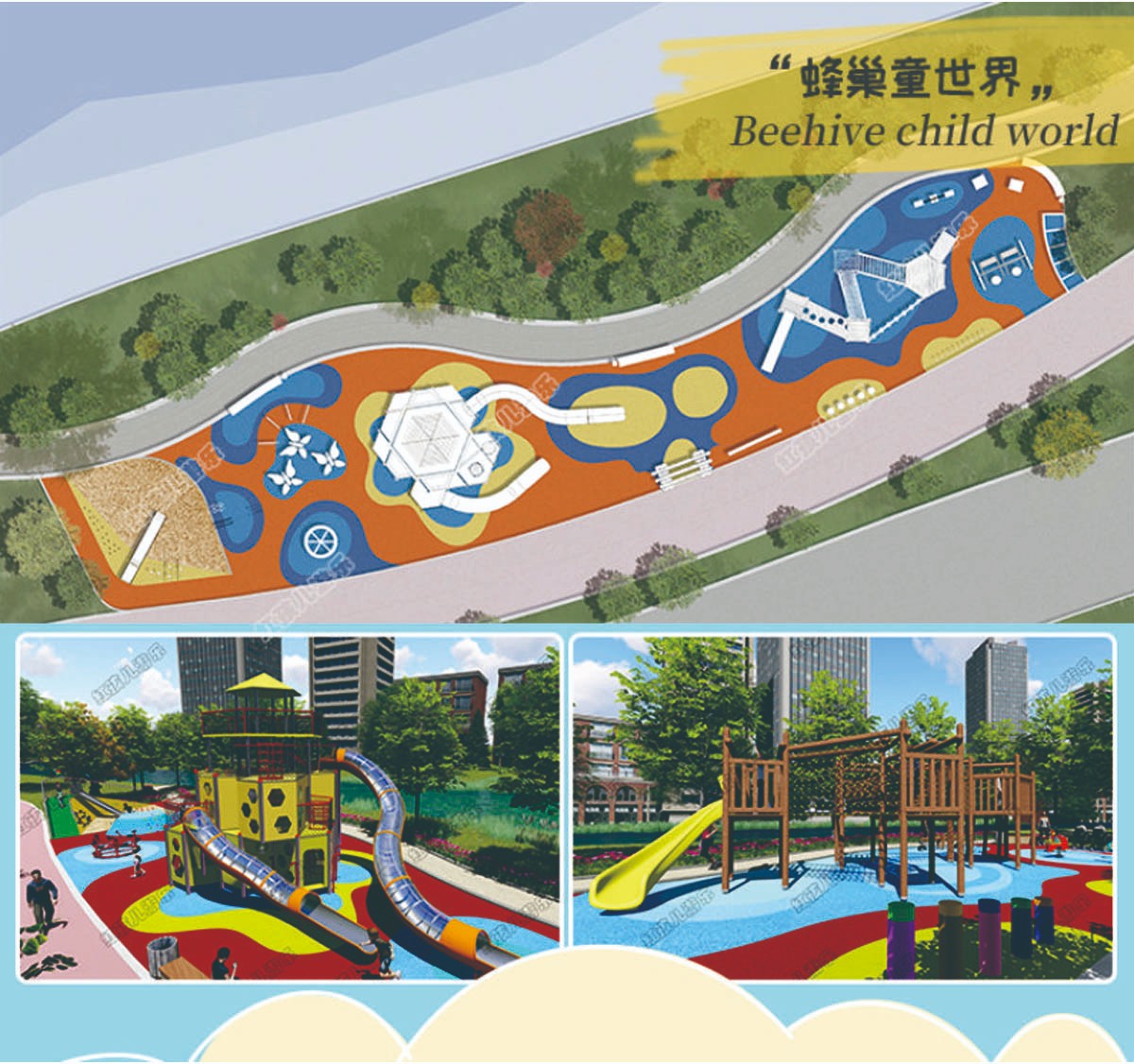 项目简介:温江玺龙湾蜂巢王国是由成都鸿懋投资有限责任公司出资打造的开放式高级社区配套乐园,以蜜蜂为主题,蜂巢造型的大型主题滑梯,搭配木质拓展设施,有趣的亲子互动设施,项目占地面积虽然不大但是主题突出,造型精致,深受业主家庭喜爱。
