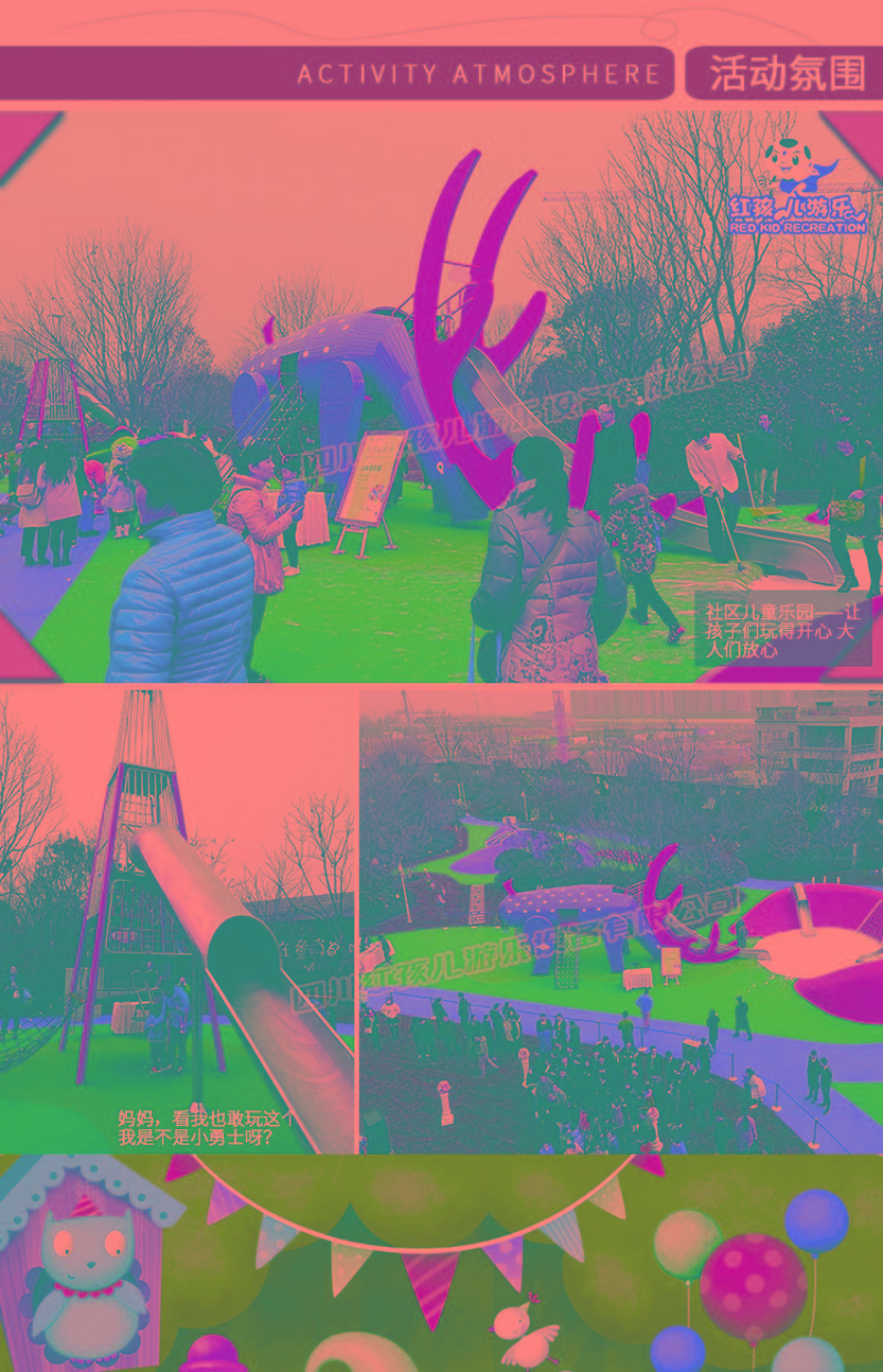 项目介绍:华远集团成立于1993年,主要业务以房地产配套为主,华远枫悦属于华远旗下知名房地产楼盘,项目总占地面积130亩,总建筑面积40万m²,儿童乐园为1800m²儿童成长园区的一部分,占地面积约为1000m²,皆为非标定制游乐产品,项目涵盖梅花鹿滑梯、沙池趣味乐园、蹦床乐园、攀爬乐园、带滑梯与攀爬的小木屋以及婴儿攀爬架、爬爬乐园等十多种娱乐项目。